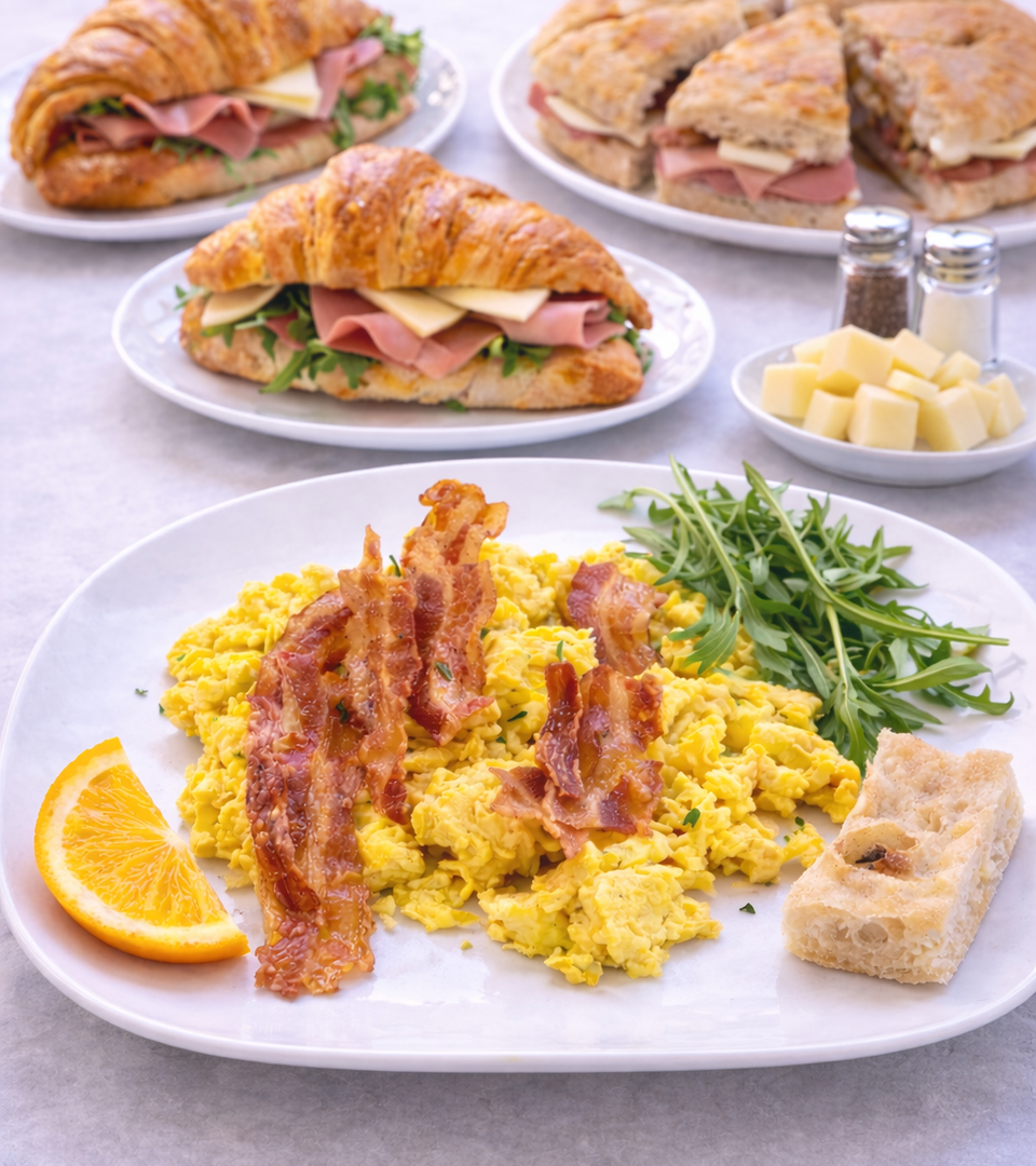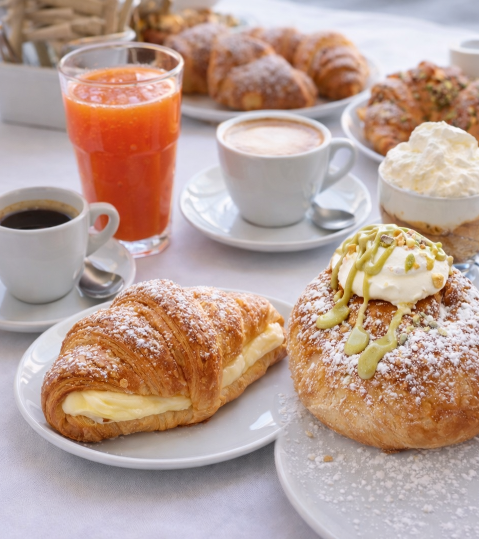 Una dolce e vasta scelta di paste e cornetti con differenti farciture. Vasta anche la sezione salata con focaccine farcite, panini, cornetti salati, uova con o senza bacon ed altro.